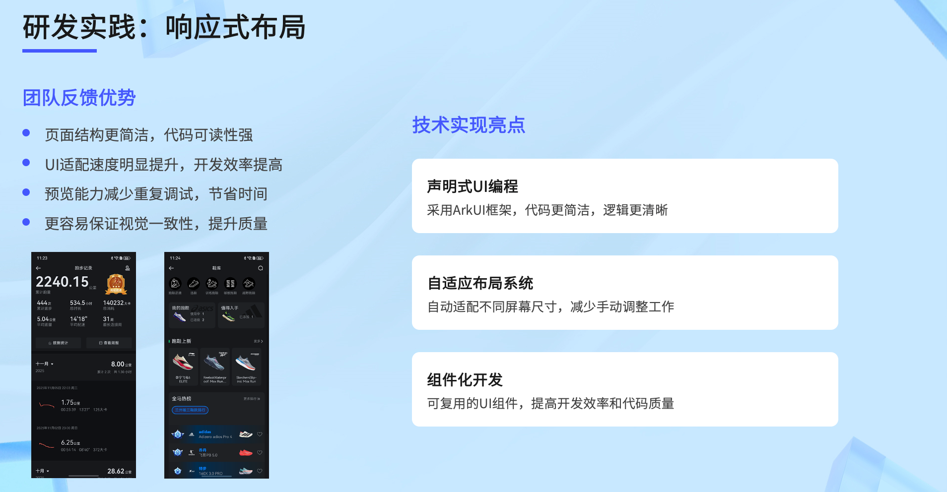 1)响应式布局适配:直接复用安卓的UI设计,无需重新搭建UI体系,节省大量人力成本。其优势体现在页面结构简洁、代码可读性强、UI适配速度快、开发效率高,且预览能力减少了重复调试,更容易保证视觉一致性。技术层面通过声明式UI编程(采用ArkUI框架)、自适应布局系统、组件化开发实现高效适配