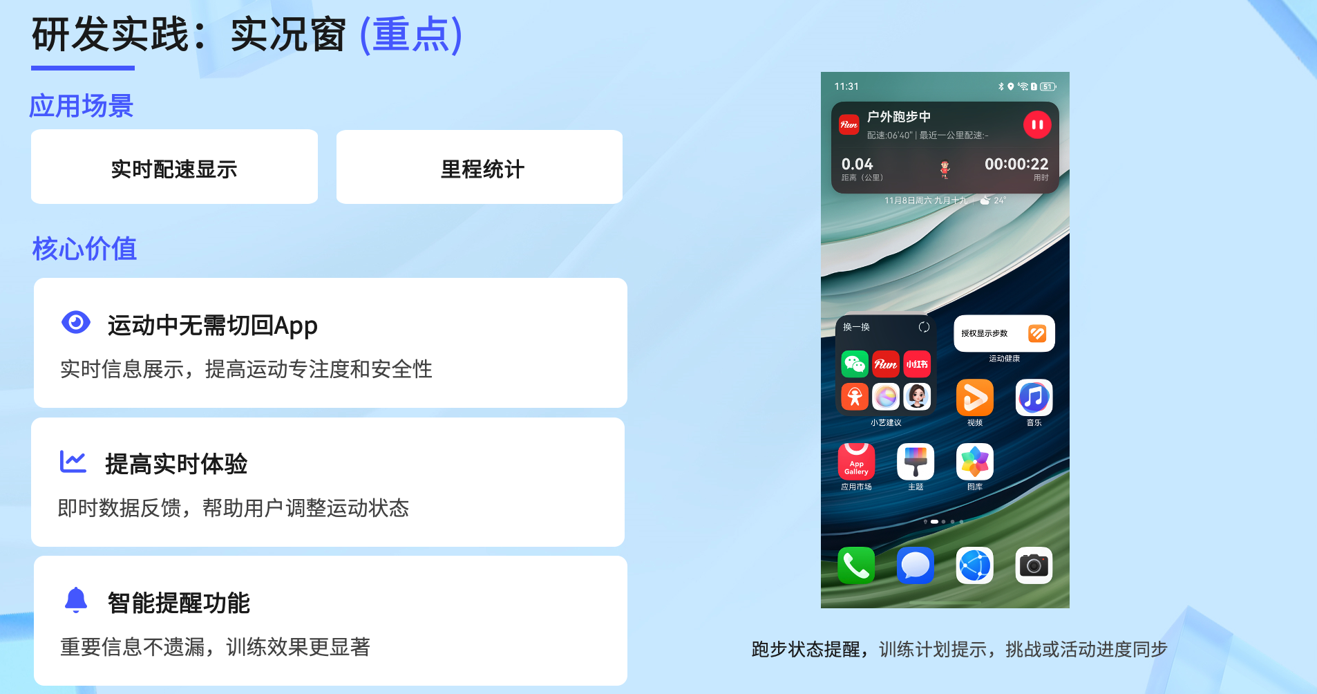 2)实况窗功能(重点实践):作为鸿蒙对运动类应用最具价值的延伸能力,实况窗可实时展示配速、里程、步数等跑步数据,核心价值体现在:
